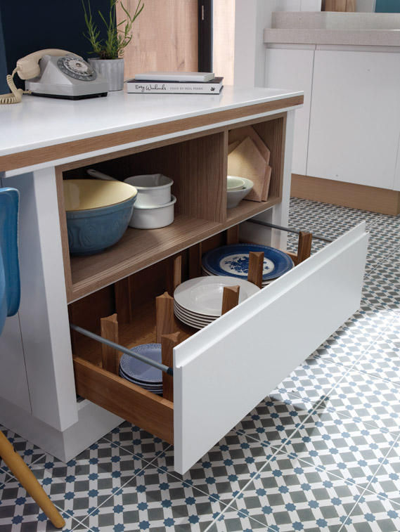 The extensive range provides customers with the choice of pull out larders, glazed letterbox wall units, curved corners and chunky posts.